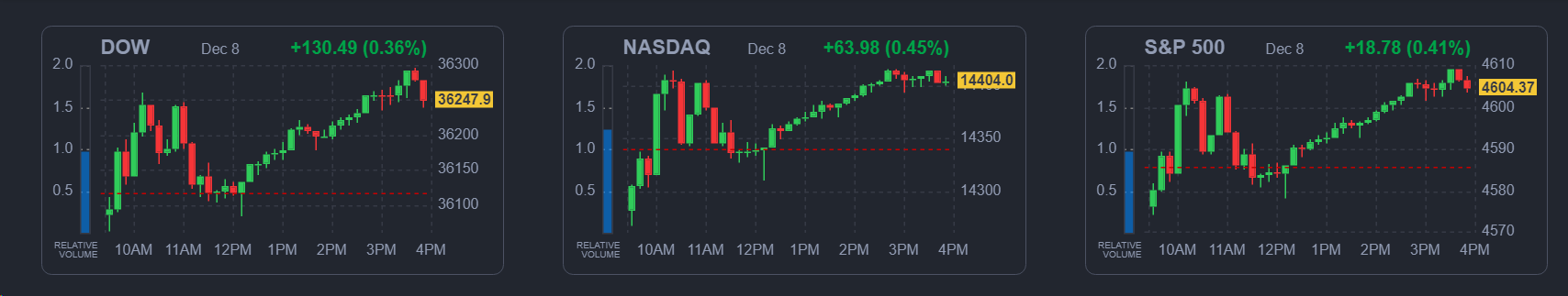 오늘 뉴스로 보는 세상 20231208 U.S. Market Closing - 06:00 기준 기술주 강세에 3대지수 일제히 '상승 DOW ▲ 36,117.38 (0.2%) S&P500 ▲ 4,585.59 (0.8%) NASDAQ ▲ 14,339.99 (1.4%) RUSS 2K ▲ 1,868.25 (0.9%) PHLX 반도체지수 ▲