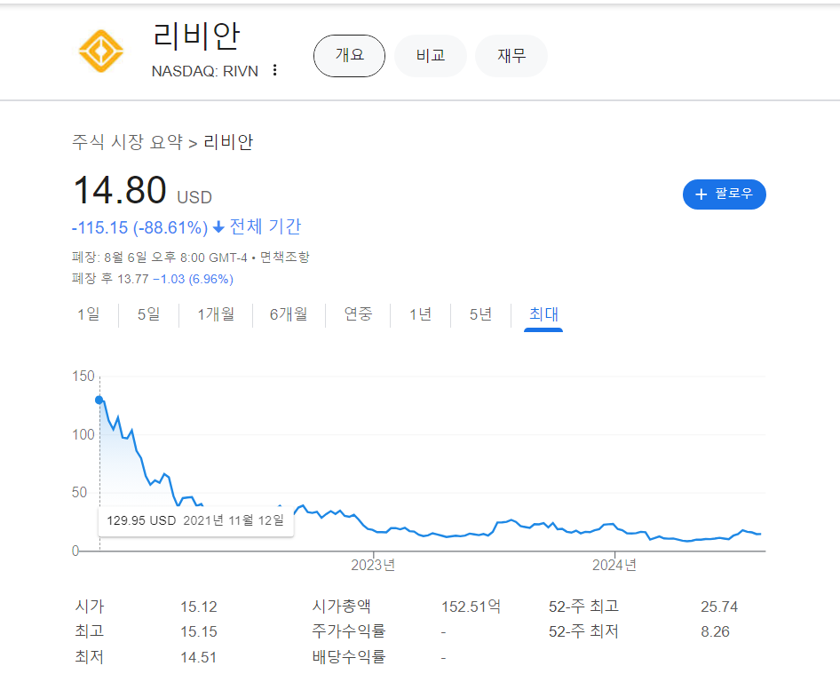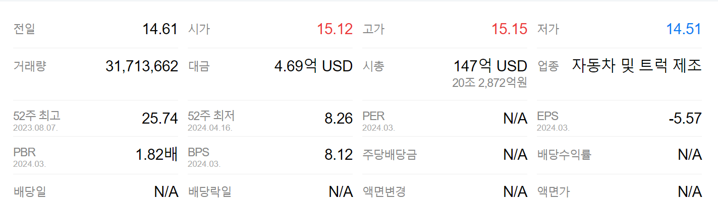 - 리비안의 주가는 전기차에 대한 수요가 예상보다 둔화하고, 회사의 현금 소각으로 인해 올 들어 37% 하락했다. 이날 정규장에선 1.3% 상승한 14.80달러로 장 마감했다. 실적 공개 후 시간외 거래에선 7% 넘게 빠지고 있다.