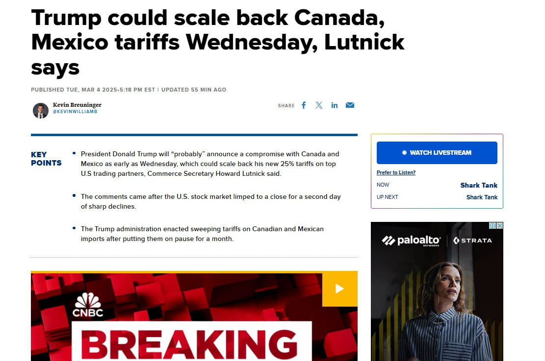 - 발표 일정: 하워드 러트닉 장관은 멕시코와 캐나다에 대한 25% 관세를 완화하는 방안을 5일 발표할 수 있다고 언급했습니다. 이는 관세 부과 하루 만에 이루어질 가능성이 있습니다 .