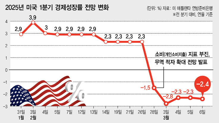 - 미국 경제성장률을 실시간으로 추정하는 애틀랜타 연방준비은행의 지디피나우(GDPnow)는 지난 6일(현지시각) 올해 1분기 미국 경제성장률을 -2.4%(전기 대비 연율 기준)로 제시했다.