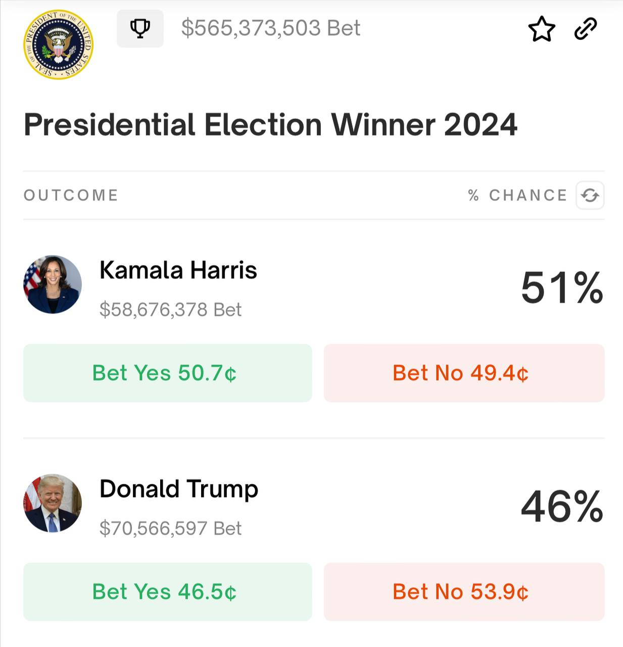- 폴리마켓에 따르면 이때 해리스의 예측 당선 확률은 약 20% 가까이 상승했으며 현재는 대선 토론 이전 바이든의 예측 당선 확률이었던 34.5%를 넘어선 44%에 위치하며 빠르게 트럼프를 추격하고 있다.