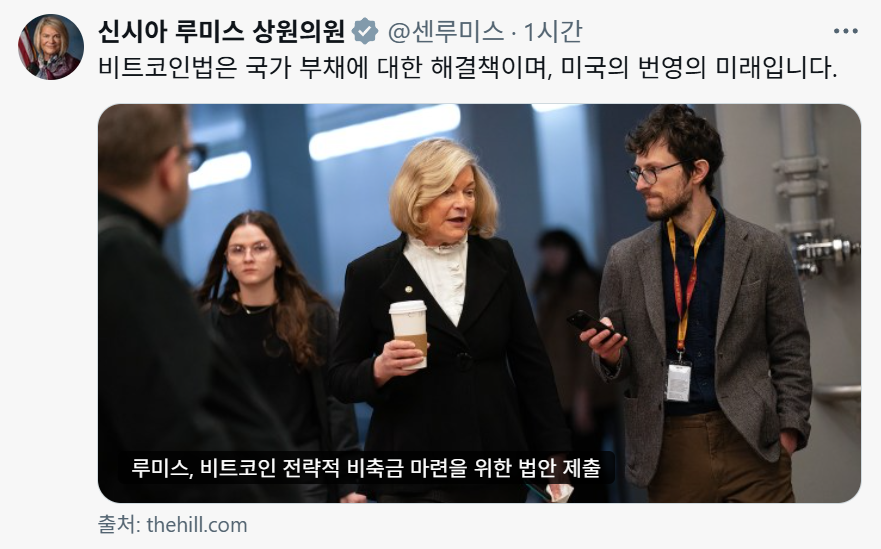 - 친 암호화폐 성향의 미국 상원의원 신시아 루미스가 자신의 X를 통해 "미국 정부의 '비트코인 전략 비축안'을 공식화하는 내용을 골자로한 법안을 재발의했다"고 밝혔다.