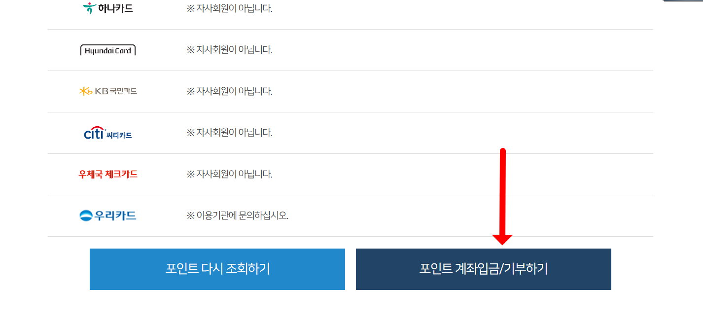 조회 버튼을 누르면 각 카드사마다 얼마의 포인트가 있는지 볼수 있습니다.