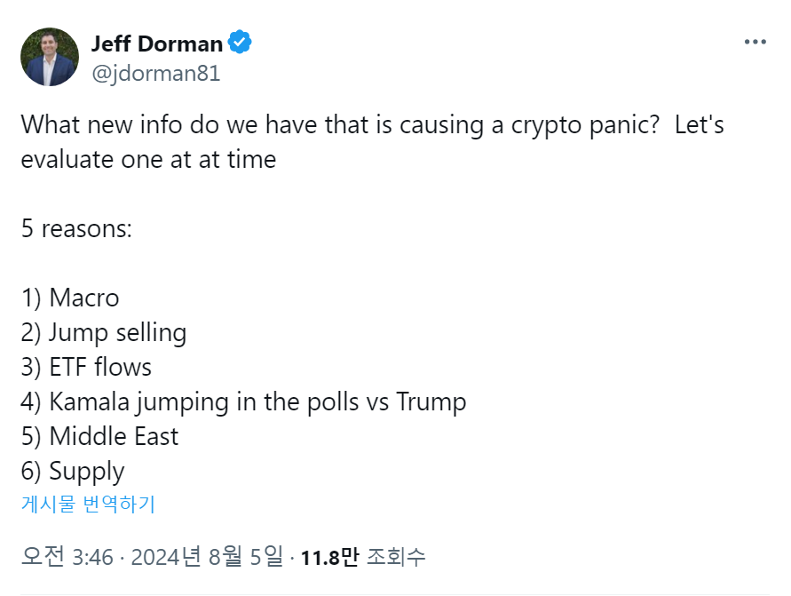 투자회사 아카(ARCA)의 최고정보책임자(CIO) 제프 도만(Jeff Dorman)이 암호화폐 시장에 패닉이 발생한 6가지 이유를 4일(현지시간) 엑스에 공유했다.