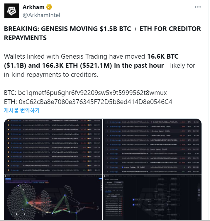 - 아컴 인텔리전스(Arkham Intelligence)의 온체인 데이터에 따르면, 제네시스는 총 15억 달러치를 이동시켰으며, 이는 약 11억 달러 가치의 1만 6,600 BTC와 약 5억 2,100만 달러 가치의 16만 6,300 ETH를 포함한다.