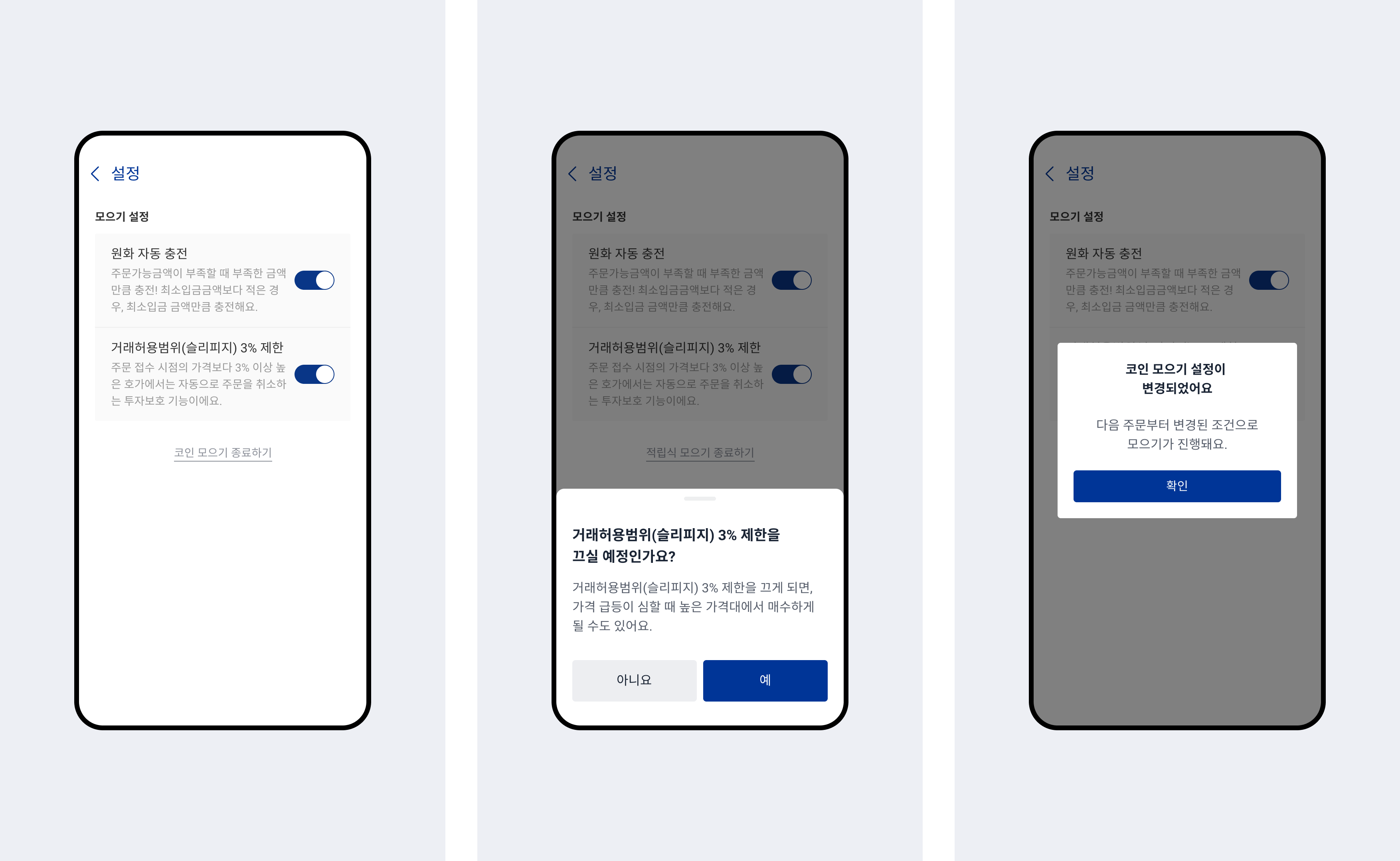거래 허용범위 (슬리피지) 3% 제한 OFF : 주문 신청 금액 중 부족한 금액 + 수수료 (주문 신청 금액 기준), 1,000 KRW 단위 절상