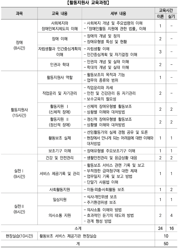 - 교육 내용은 장애에 대한 이해, 사회복지의 기초, 활동지원사의 역할 등으로 구성되어 있어요.