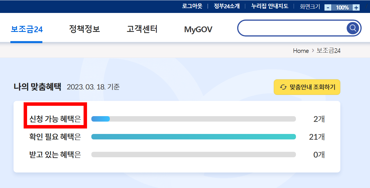 내가 받을 수 있는 국가 보조금을 한 번에 확인하고 신청할 수 있는 정부 24 서비스입니다.