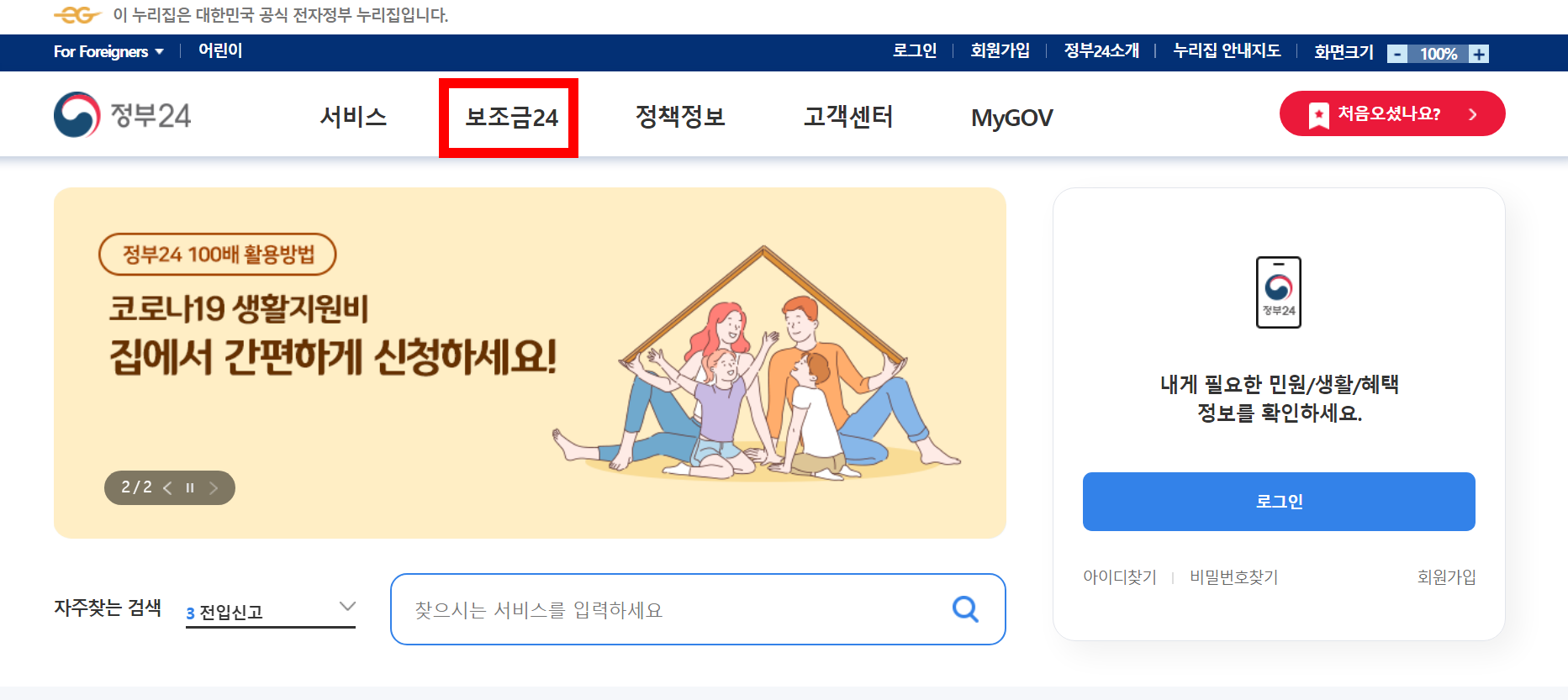 1. 정부 24 <홈페이이지 또는 앱>에서 보조금 24를 클릭하고 로그인하세요