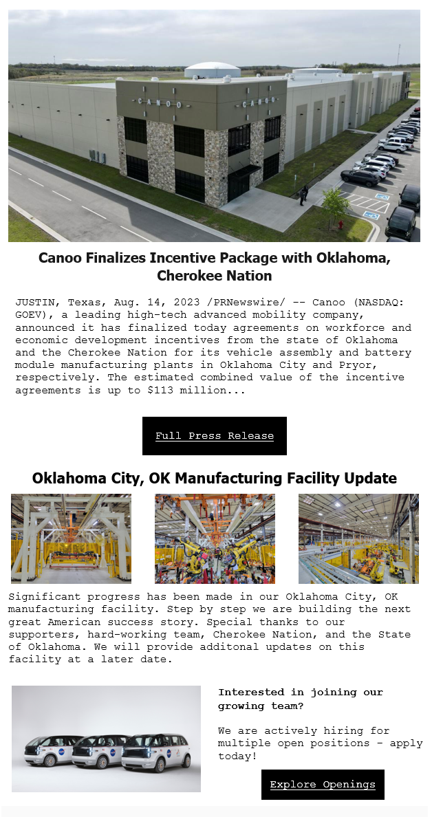 - Canoo 제조 시설, 오클라호마 시티 우리는 쉽고 쉽게 사용할 수 있는 뉴스나 기타 정보를 재활용하는 습관을 만들고 싶지 않습니다. 그러나 이 업데이트에 대한 많은 설명이 많은 사람의 받은 편지함에 도달하지 못한다는 소식을 듣고 전달하기에 적합하다고 결정했습니다.