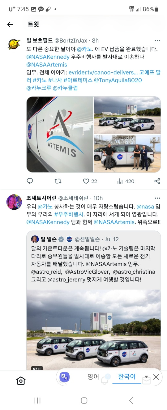 "오늘은 모든 발사의 첫 9마일 동안 우주 비행사를 수송하기 위해 우리의 역할을 수행하기 위해 열심히 일한 Canoo와 모든 파트너에게 매우 자랑스러운 날입니다."