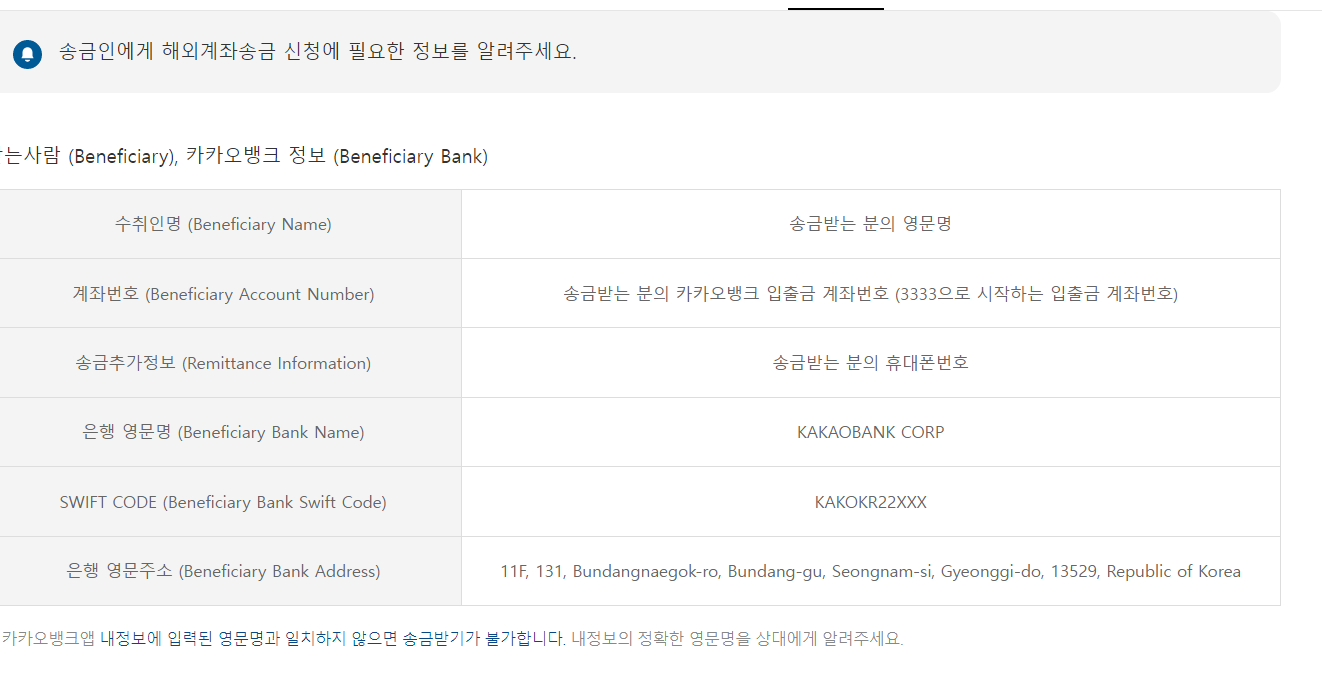 ◆ 해외에서 카카오뱅크 계좌로 수취할 때 해외송금인에게 제공해야 하는 정보