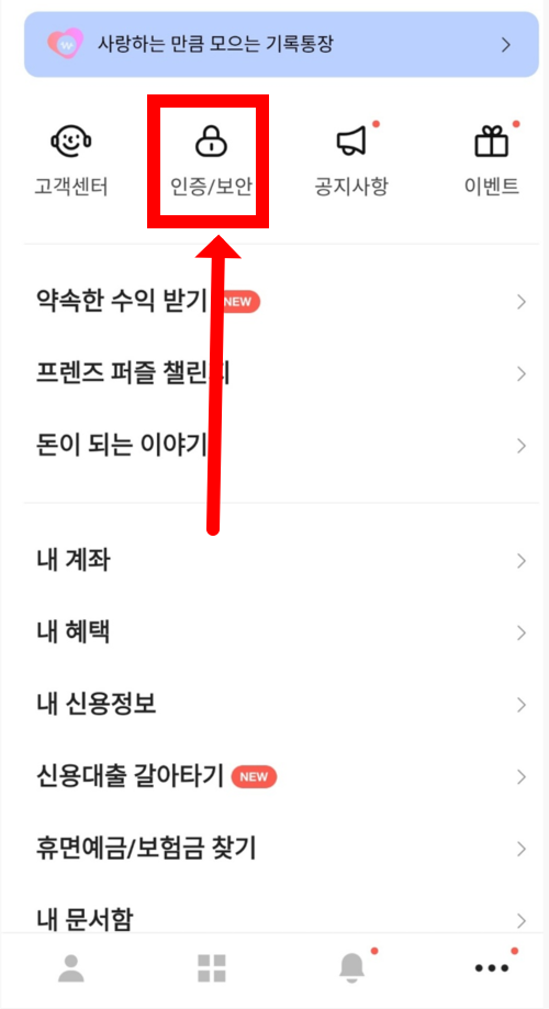- 그다음 화면에 인중/보안 메뉴를 선택하세요.