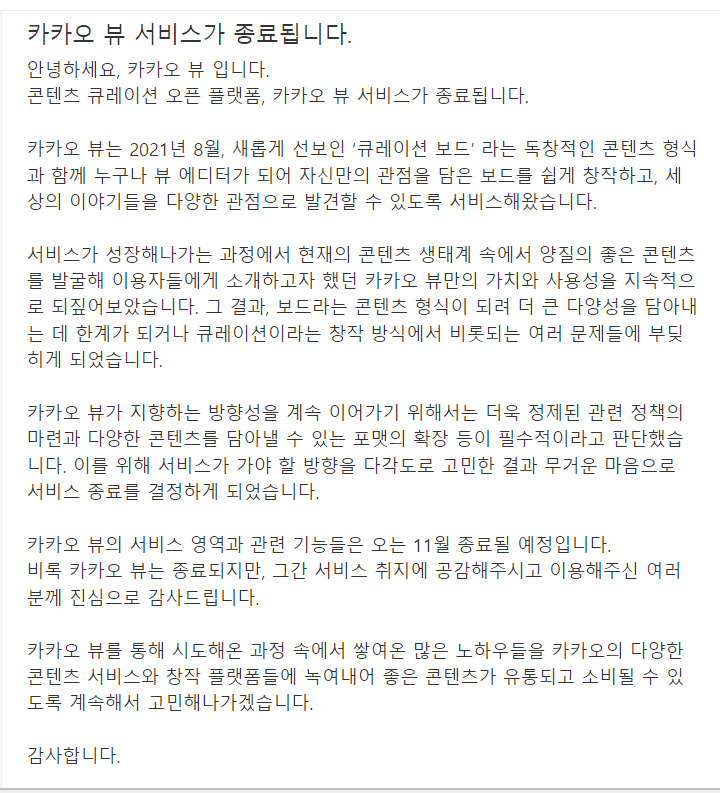 - 카카오는 "카카오 뷰가 지향하는 방향성을 계속 이어가기 위해서는 더욱 정제된 관련 정책의 마련과 다양한 콘텐츠를 담아낼 수 있는 포맷의 확장 등이 필수적”이라면서 “가야 할 방향을 다각도로 고민한 결과 무거운 마음으로 서비스 종료를 결정하게 됐다"고 공지했다.