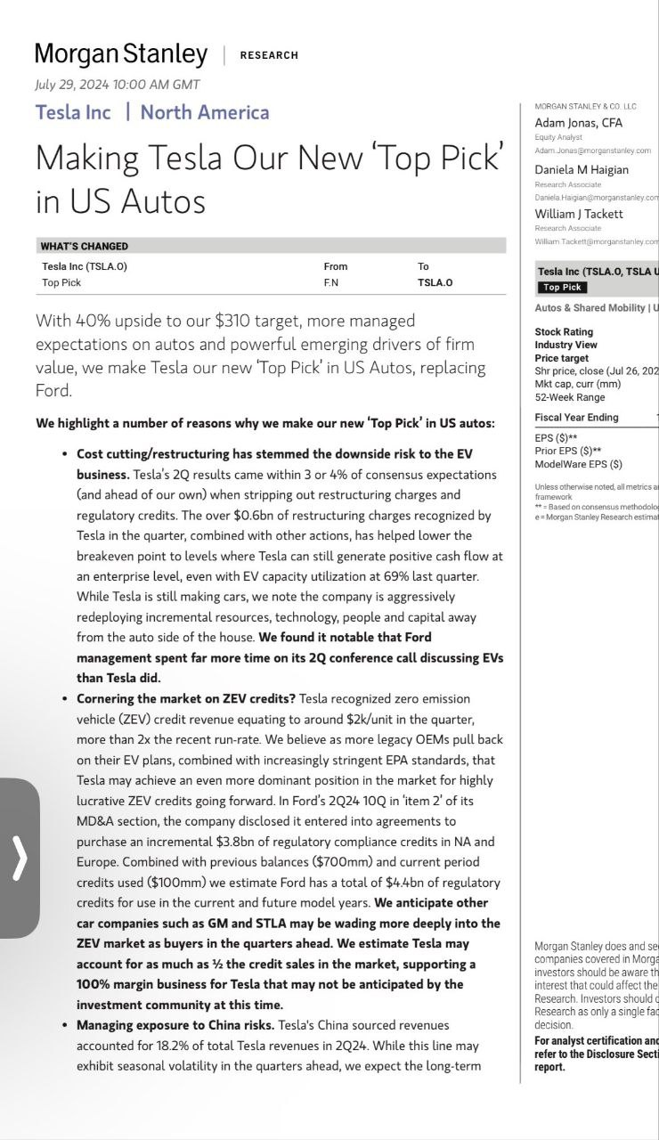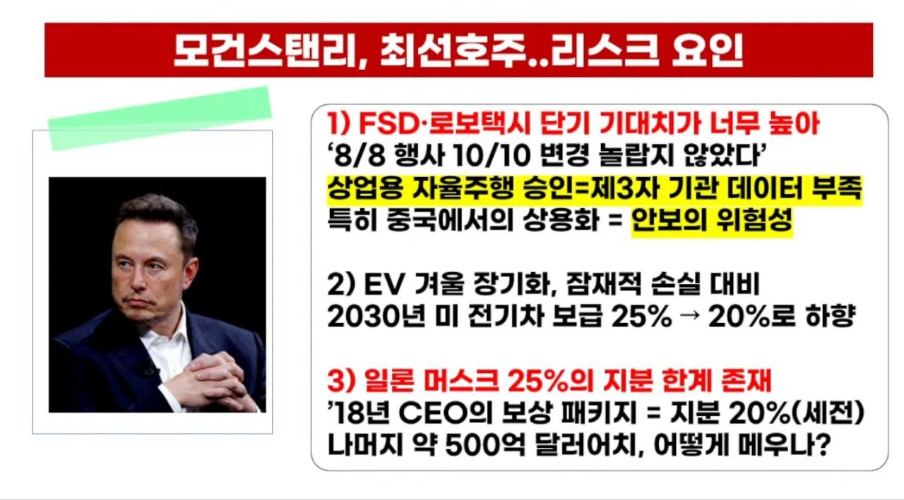 - 모건스탠리는 테슬라의 투자의견을 '비중확대'로 상향조정하고 목표주가를 310달러로 제시했다.