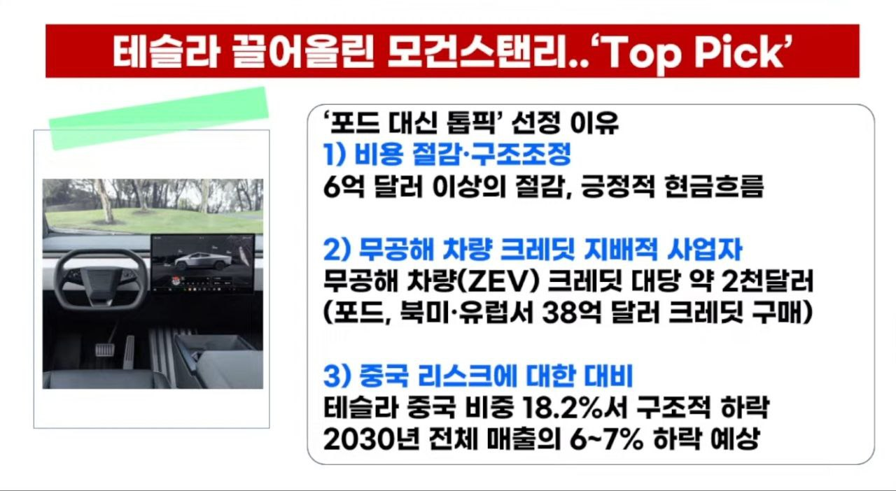- 테슬라 강세론자로 알려진 모건스탠리가 미국 자동차 업종 톱픽을 포드에서 테슬라로 교체한 영향인 것으로 풀이된다.