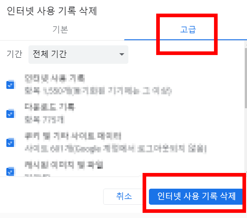 - 인터넷 사용기록 삭제> 고급> 삭제: 여기서 중요한 점은 기본애서 기록 삭제하면 해결 안 됩니다. 고급으로 가서 체크박스 전부 설정한 루 삭제하셔야 해결됩니다.