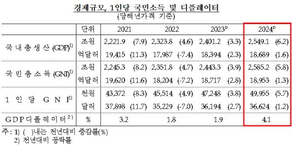 - 물가상승분을 포함한 2024년 명목 국내총생산은 2549조1천억 원, 달러 기준 1조8689억 달러로 2023년보다 각각 6.2%, 1.6% 성장했다.