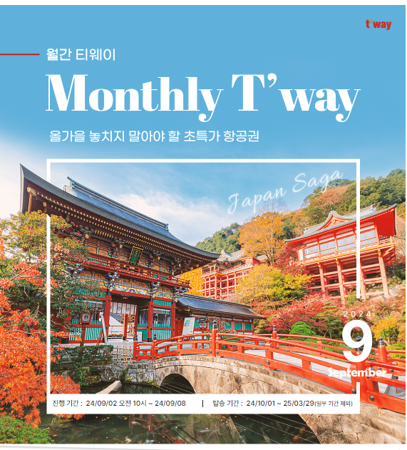 - 티웨이항공은 오는 8일까지 월간 티웨이 9월 프로모션을 진행 중이다.