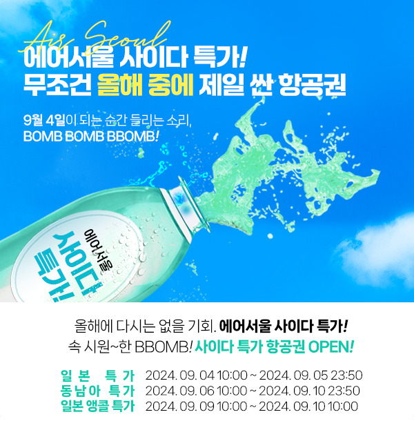 - 에어서울은 연중 최대 규모의 할인행사 ‘사이다 특가’를 이날 오전 10시부터 진행 중이다.
