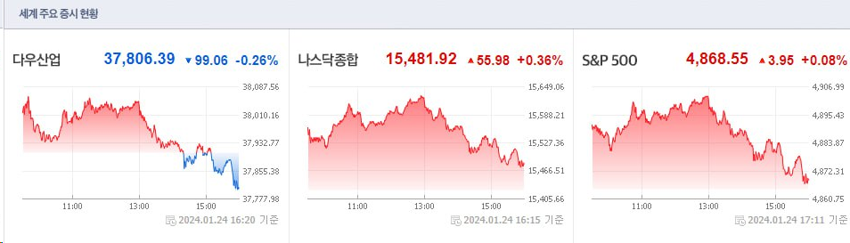 2024년 1월 26일 오늘의 뉴스로 배우는 세상 2024.01.26 U.S. Market - DOW ▲ 38,049.13 (0.6%) S&P500 ▲ 4,894.16 (0.5%) NASDAQ ▲ 15,510.50 (0.2%) RUSS 2K ▲ 1,975.88 (0.7%) PHLX 반도체 ▼ 4,472.26 (-0.2%) S&P 500, 美 GDP 호조에 사