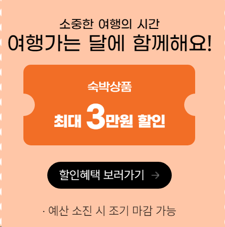역대급 숙박혜택을 확인하세요 - 1박 5만원을 초과하는 숙소를 이용하면 최대 3만원 할인권을 준다.
