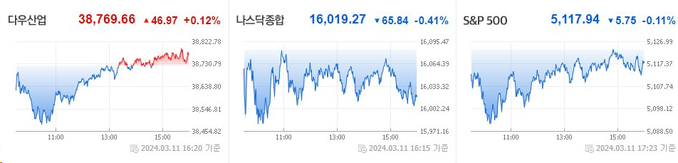 2024년 3월 12일 오늘의 뉴스로 배우는 세상 ★ 2024.03.12 U.S. Market ★ DOW ▲ 38,769.66 (0.1%) S&P500 ▼ 5,117.94 (-0.11%) NASDAQ ▼ 16,019.27 (-0.4%) RUSS 2K ▼ 2,064.01 (-0.9%) PHLX 반도체 ▼ 4,890.20 (-1.4%) 뉴욕증시 상승