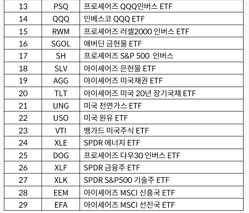 AGG, DIA, DOG, EEM, EFA, EWA, EWJ, FXI, GLD, IAU, IJH, IWM, PSQ, QQQ, RWM, SGOL, SH, SLV, SPY, TLT, TQQQ, UNG, USO, VTI, XLE, XLF, XLK, BITO, SQQQ - 미국주식 프리마켓, 정규장, 애프터마켓에서는 모든 종목 정상거래 가능합니다.
