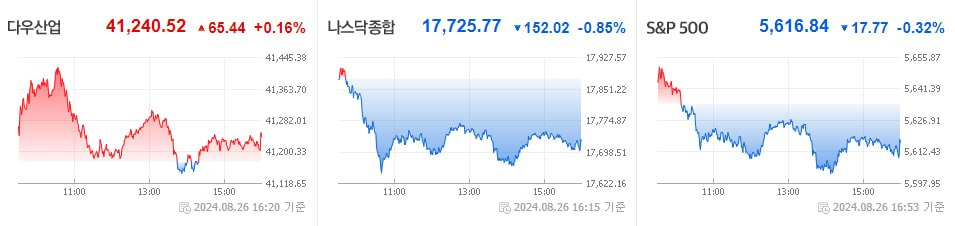 2024년 8월 27일 오늘의 뉴스로 배우는 세상 (2024.08.27) U.S. Market DOW ▲ 41,240.52 (0.2%)S&P500 ▼ 5,616.84 (-0.3%)NASDAQ ▼ 17,725.77 (-0.9%)RUSS 2K ▼ 2,217.92 (-0.0%)PHLX 반도체 ▲ 5,097.35 (1.8%) 08/27