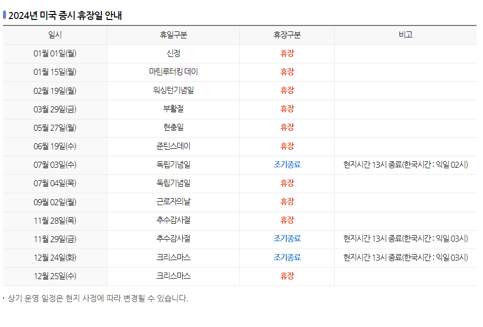 2024년 미국 주식 증시 휴장일