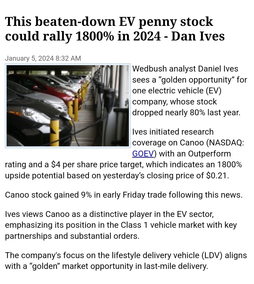게시 날짜: 12:24 2024년 1월 5일(EST) - 금요일에 회사 취재를 시작한 Wedbush의 분석가에 따르면 캘리포니아에 본사를 둔 전기 자동차 스타트업인 Canoo Inc(NASDAQ:GOEV) 는 "독특한 상업용 및 군용 EV 플레이"라고 합니다.