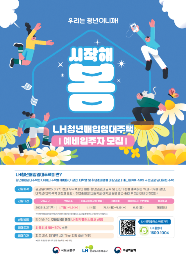 - 한국토지주택공사(LH)가 7일부터 무주택 청년·신혼부부와 중산층·서민층 등을 위한 매입임대주택 청약 접수를 시작한다.