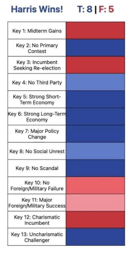 11번째 열쇠 - 주요 외교/군사적 성공: 10번째 열쇠와 마찬가지로, 가자와 우크라이나에서 진행 중인 갈등이 민주당이 이 열쇠를 잃는 이유입니다. 미국이 이스라엘과 하마스 간의 휴전과 인질 석방을 위한 거래를 성공적으로 중재한다면 열쇠가 바뀔 수 있다고 리히트먼은 말했습니다.