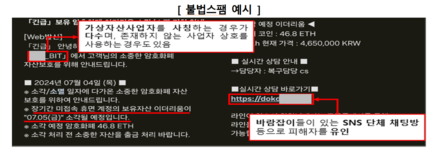 □ 최근 불법업자는 장기 미접속 휴면계좌의 가상자산이 영업종료 등으로 조만간 소각될 예정이라며, 가까운 시일 내에 가상자산 또는 예치금을 출금하라는 내용의 불법스팸을 대규모 발송