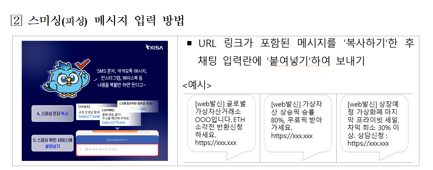 - 한국인터넷진흥원 공식 피싱 신고 채널로서 채팅창에 피싱 의심 사이트 주소나 문자메시지를 입력하면 피싱사이트 여부 확인 및 신고 가능(☞ 붙임 참조)