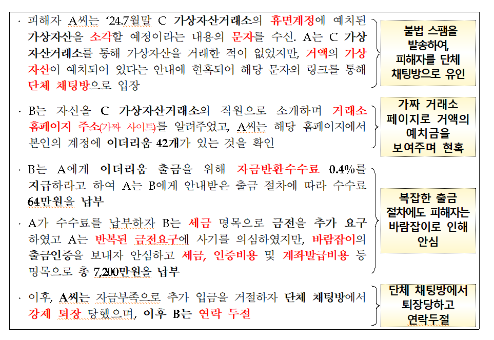 - 단체 채팅방을 통해 접속한 가짜 가상자산거래소에서 거액의 가상자산이 예치되어 있는 것처럼 화면 제공(출금은 불가)