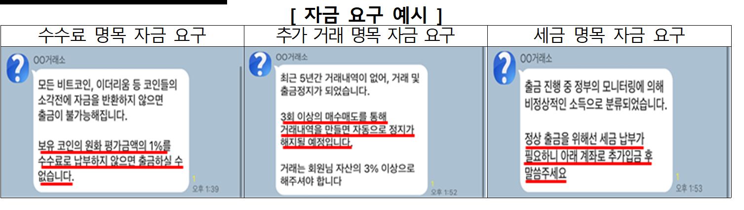 - 피해자가 출금을 요청하는 경우 불법업자는 수수료, 세금 및 추가 가상자산 거래 등 다양한 명목으로 계좌이체를 반복 요구
