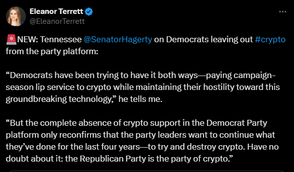 - 엘리노어 테렛(Eleanor Terrett)이 X를 통해 "민주당이 공개한 당 플랫폼에 블록체인, 비트코인 관련 언급이 전혀 없는 것으로 알려진 가운데, 테네시주 상원의원 빌 해거티(Bill Hagerty)가 '당 지도부가 지난 4년 동안 해온 일, 즉 암호화폐 파괴 계획이 계속 유지될 것임을 재확인한 것 뿐'이라고 말했다.