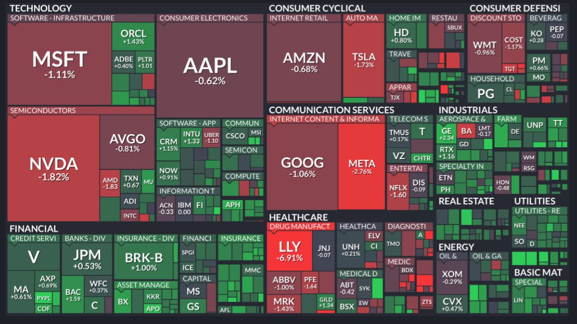 - 헬스케어도 비교적 큰 폭 하락했는데 일라이 릴리가 실망스러운 매출 가이던스를 제시하며 -6.59% 하락한 것이 영향을 미쳤습니다