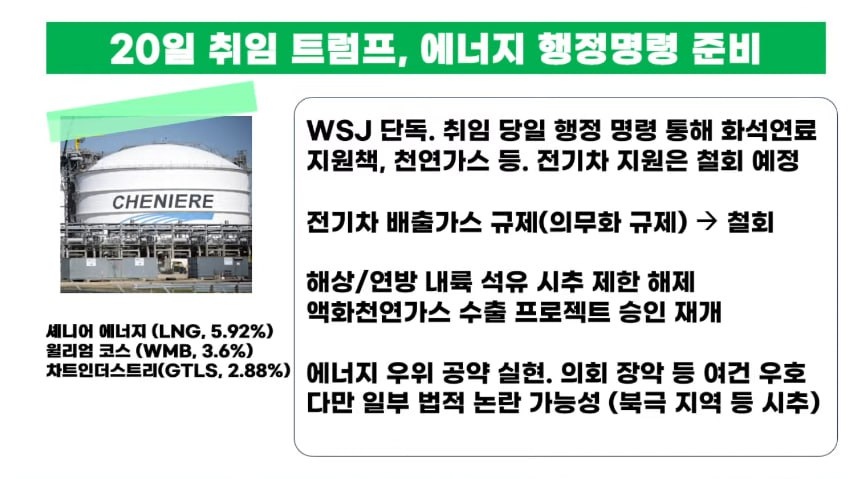 - 가자지구 휴전 임박 소식과, 트럼트프 취임 후 첫 행정명령이 에너지 부문에 맞춰질 것이라는 보도가 영향을 미치고 있습니다