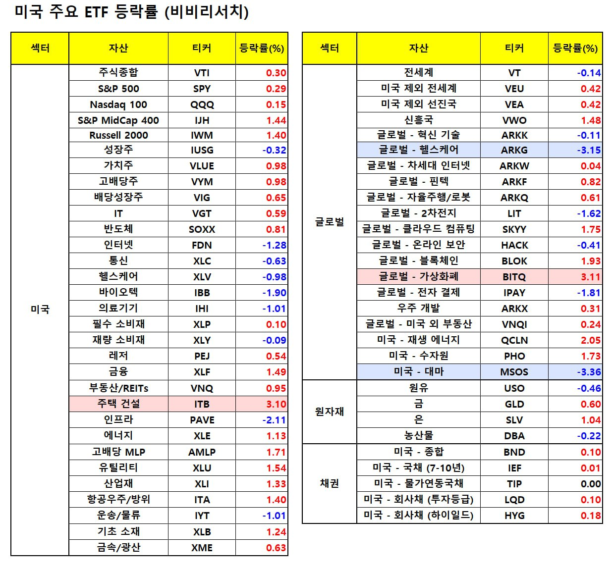 - 마이크로스트래티지(+4.19%) 등 비트코인 관련주 등 주요 테마주 대부분 상승.