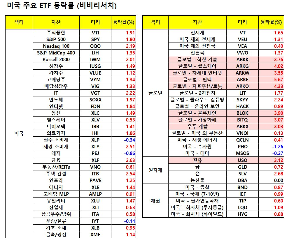 - 커뮤니케이션 섹터가 2.7% 오르며 가장 크게 상승했고, 이어서 임의소비재, 금융, IT 업종이 2% 넘게 상승했습니다/