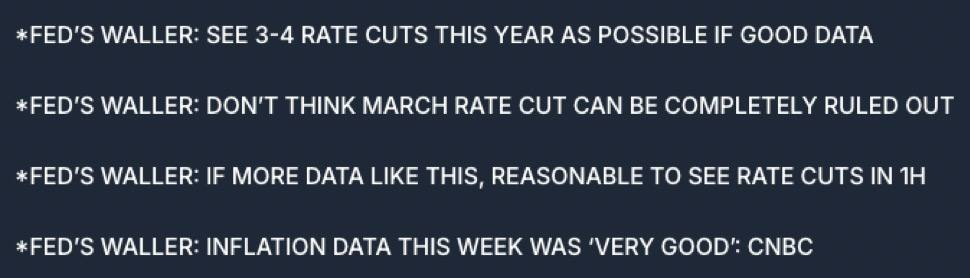 - 소매판매 발표에 달러와 금리의 상승이 진행되기도 했지만, 되돌림이 유입되며 약세로 전환. 특히 크리스토퍼 월러 연준 이사가 12월 물가지표들은 매우 긍정적이며 이러한 추세가 진행될 경우 3월 금리 인하 가능성을 배제할 필요가 없다고 언급하고, 데이터에 따라 올해 3~4번의 금리인하도 가능하다고 주장하자 달러와 금리 하락폭이 좀더 확대. 이에 주식시장은 대형 기술주 일부의 부진에도 견조한 모습이 진행.
