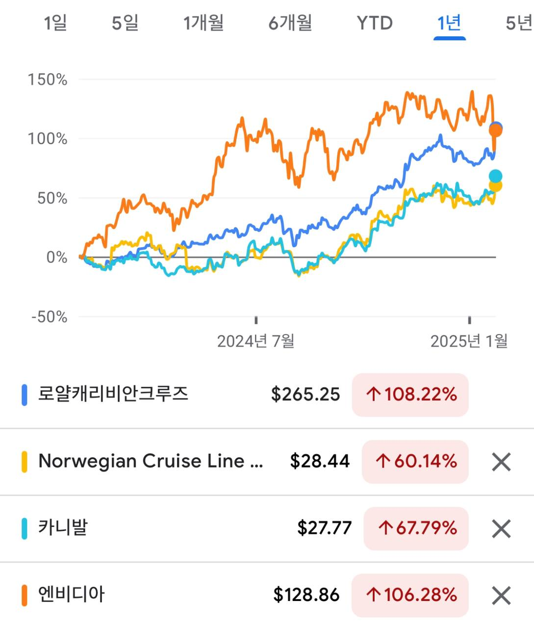 - - 실적 개선이 예상되는 크루즈 선박 운영회사인 Royal Caribbean의 주가가 12% 상승함.
