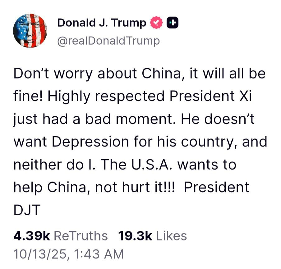- 트럼프 대통령은 최근 희토류에 대한 중국의 “적대적” 수출 통제를 언급하며 “2주 후 한국에서 열리는 아시아태평양경제협력체(APEC)에서 시 주석과 만날 예정이었으나, 이제는 그럴 이유가 없어 보인다”고 게시.