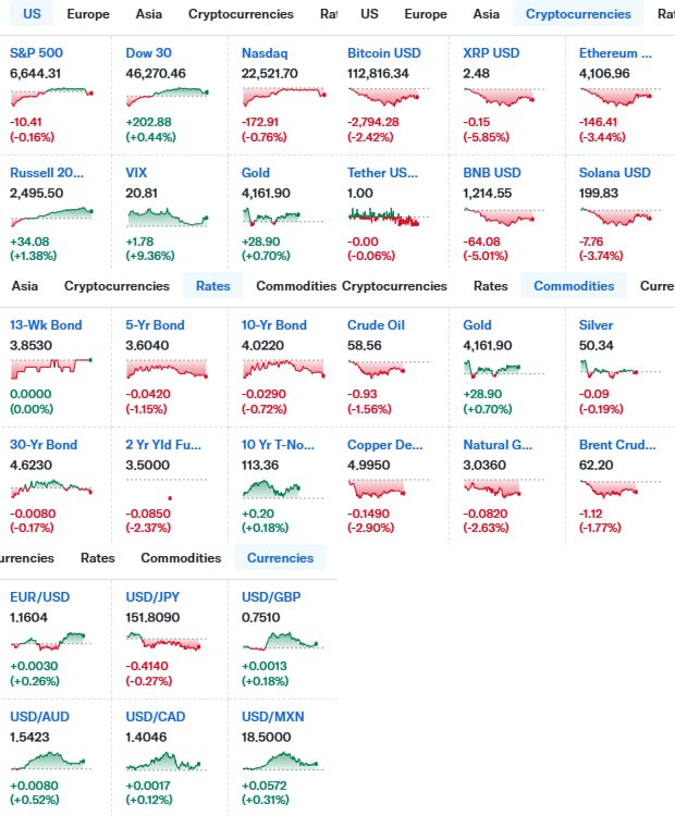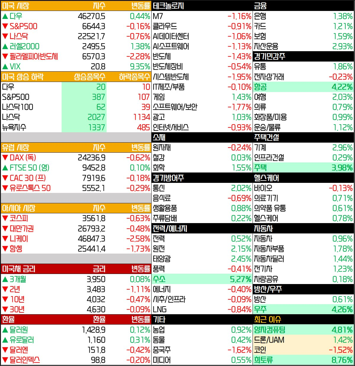 - 특징주로는 엔비디아가 -4.4% 하락한 반면 AMD는 오라클이 2026년 하반기부터 AMD AI GPU칩 5만 개를 도입할 계획이라는 소식을 전하며 +0.77% 상승했습니다