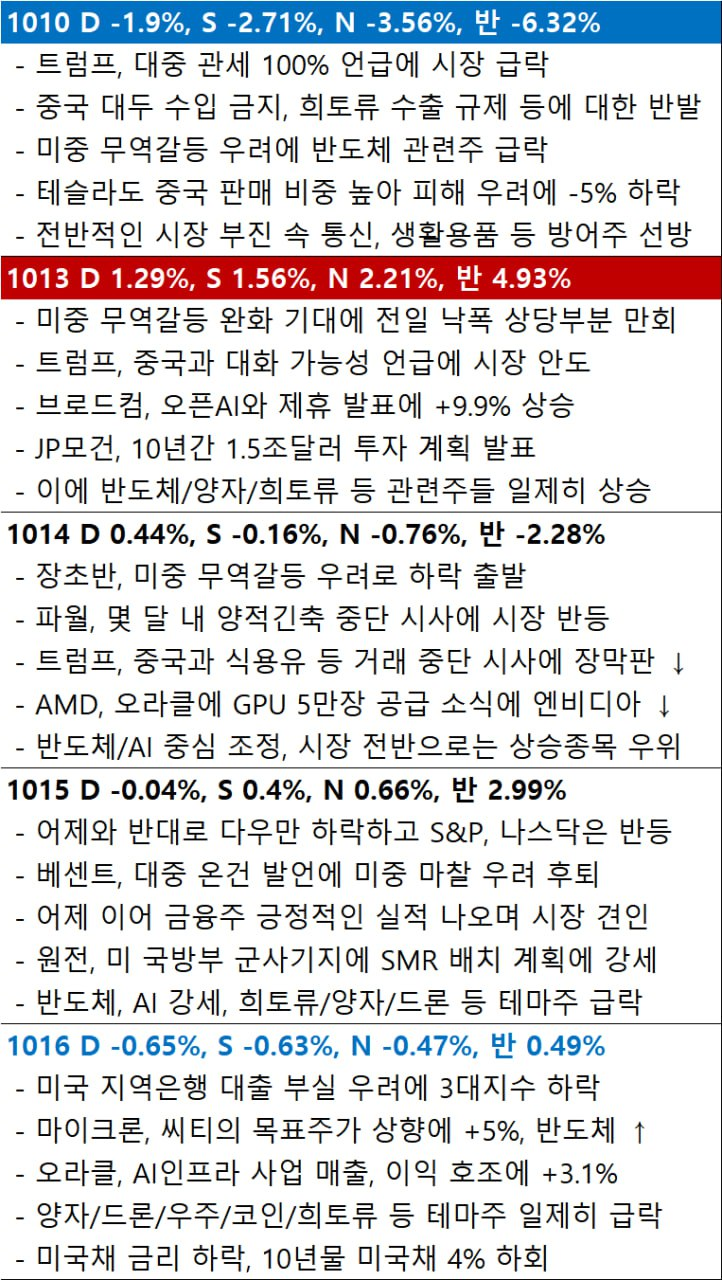 - 대형 은행들의 견조한 실적 발표에도 불구하고, 금융 시장 전반의 신용 리스크에 대한 우려가 확산되며 시장 하락 압력으로 작용.