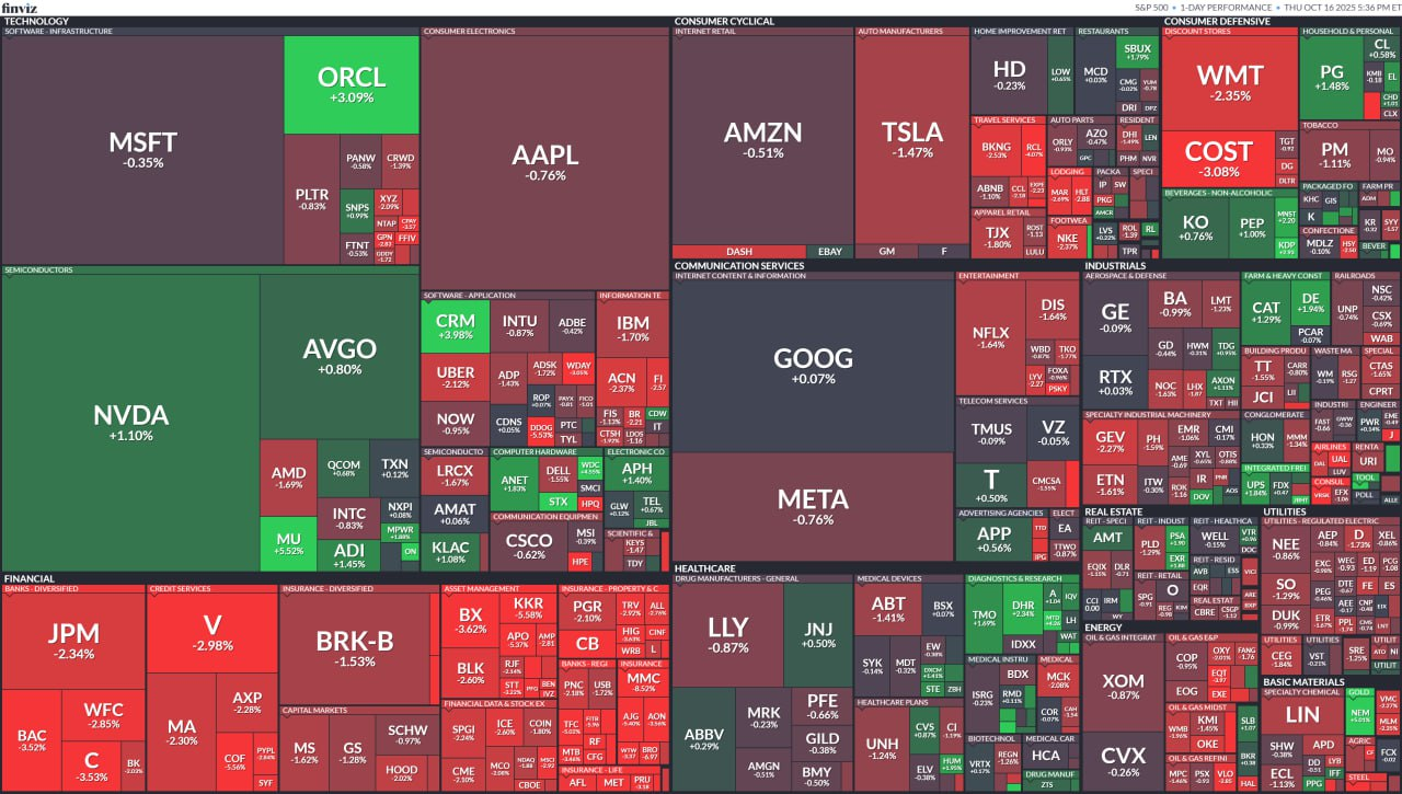 - 엔비디아 $NVDA, 오라클 $ORCL 이 상승한 기술 섹터 제외 전 섹터 하락. 금융 섹터 -2.8% 하락