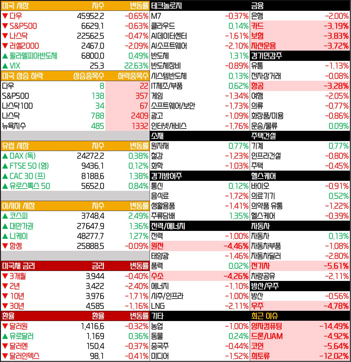 - S&P 500 -0.71%, 나스닥 -0.54%, 다우 -0.70% 하락 마감.