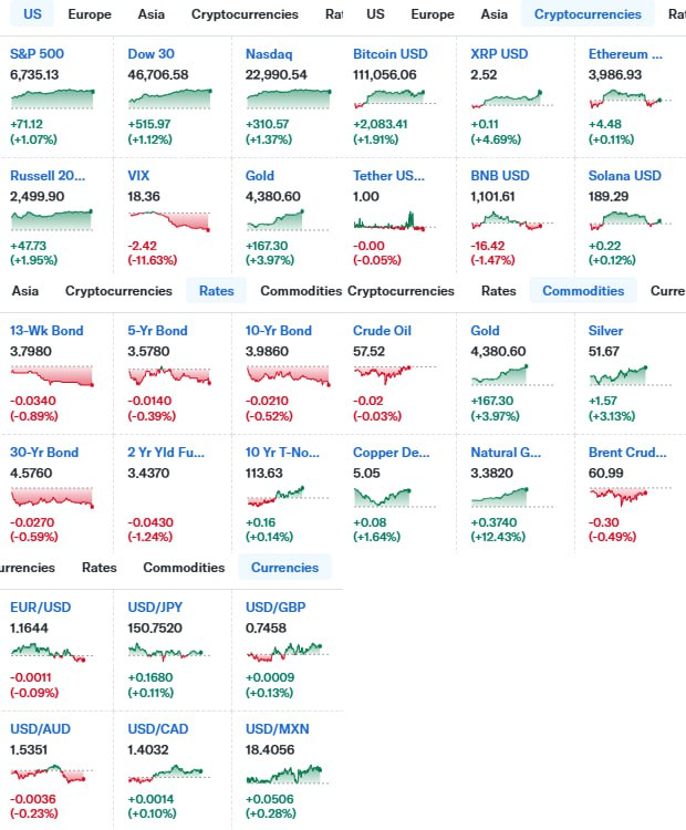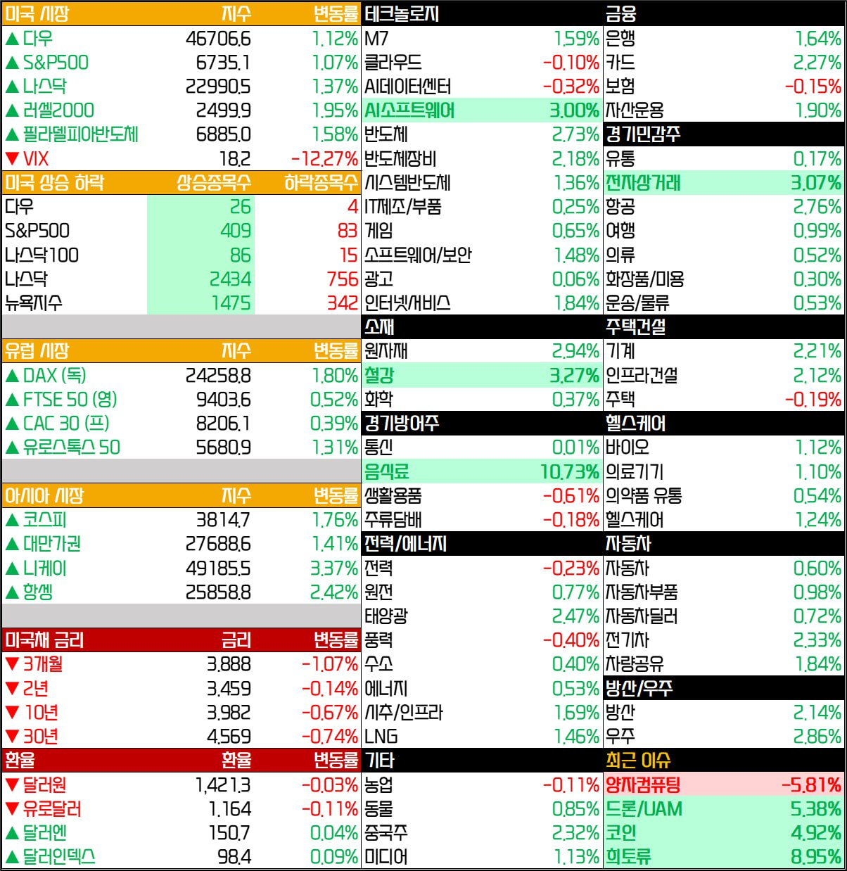- S&P 500 +1.10%, Nasdaq +1.38%, Dow +1.10% 상승 마감